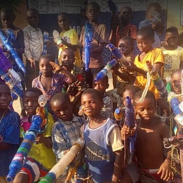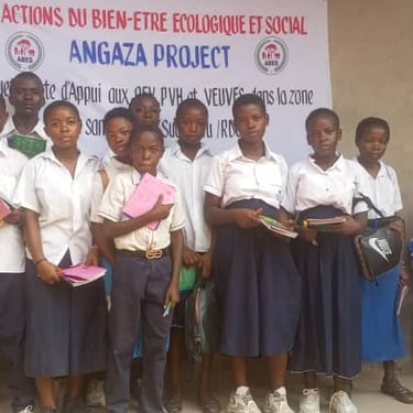 Sur la photo, on aperçoit des enfants. La plupart d’entre eux sont des OEV (orphelins et enfants vulnérables). Certains ont bénéficié de fournitures scolaires. Ils sont connus comme des enfants soldats en devenir. Leur prise en charge scolaire est d’une grande nécessité.